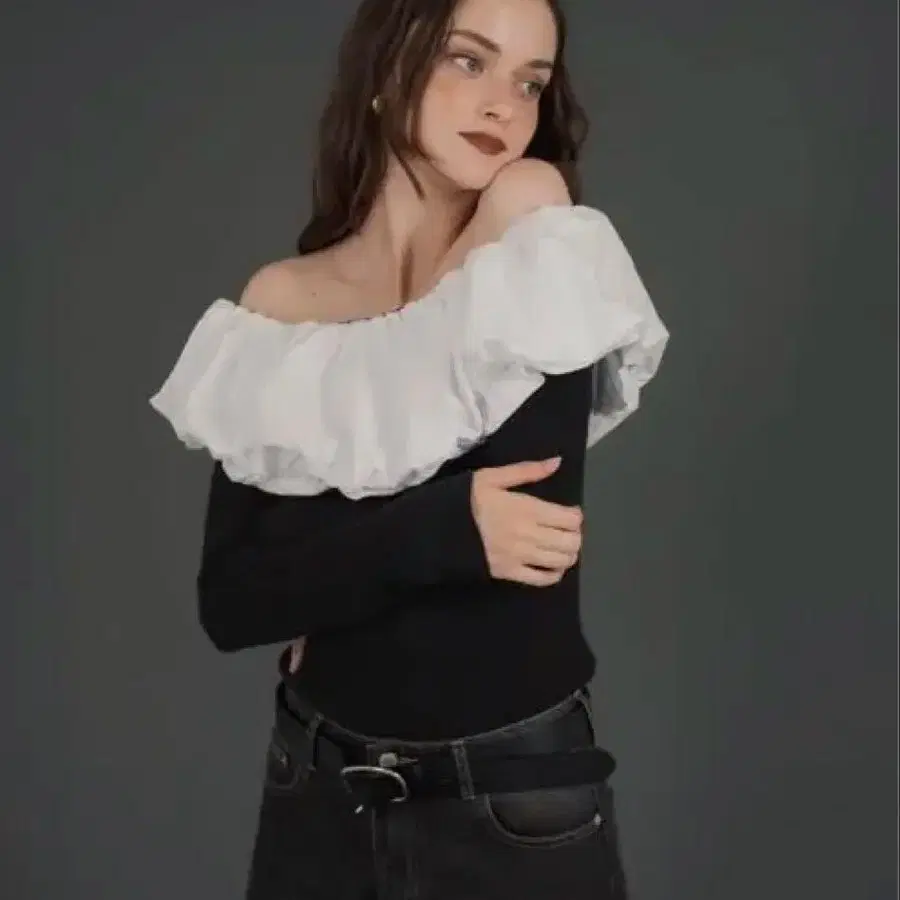 오프숄더 프릴 디자인이 특징인 핏감 있는 긴팔 니트.