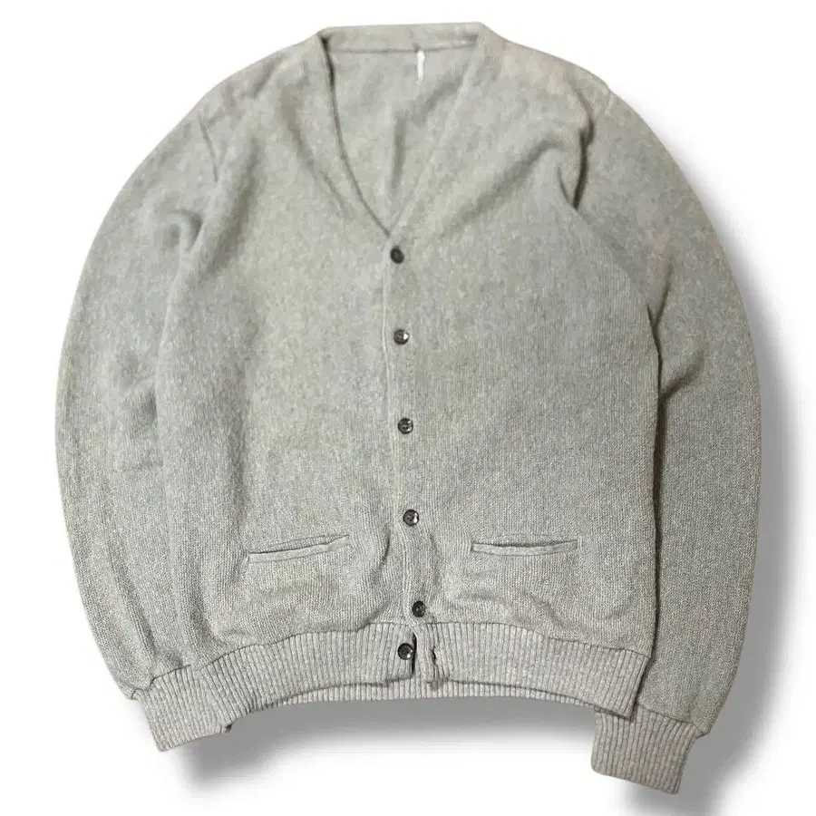 그레이 색상의 V넥 가디건입니다. 버튼과 포켓이 있습니다.
