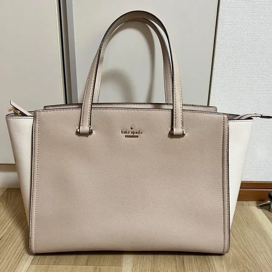 심플하고 세련된 디자인의 베이지와 화이트 핸드백.
