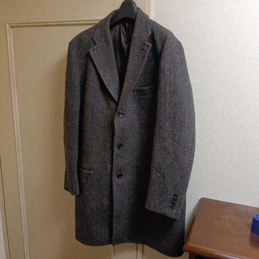 해리스 트위드 헤링본 패턴 체스터 코트 브라운