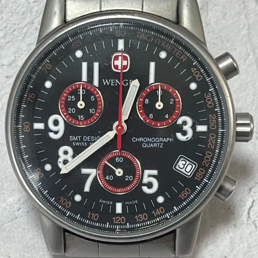 스테인리스 스틸 소재의 블랙 다이얼 크로노그래프 손목시계. 배터리 새 상품으로 작동 중.