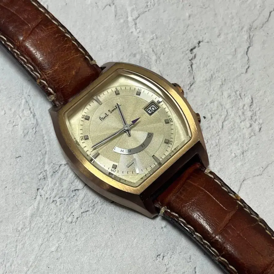 라디오 컨트롤 기능을 갖춘 Paul Smith의 솔라 전파 시계, 아이보리 다이얼과 골드 케이스가 특징입니다. 전파 수신 작동 중.
