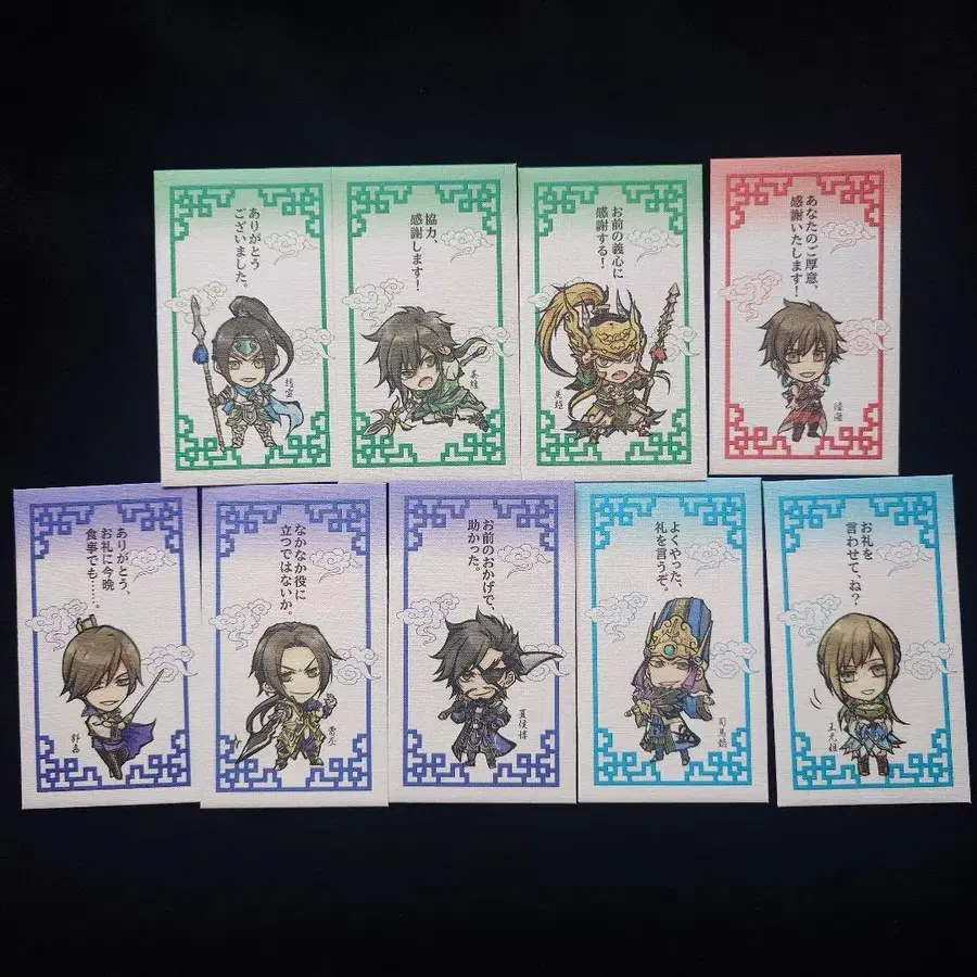 이미지 9장 세트입니다. 미사용품이며 봉투에 넣어 보관했습니다. ~도움에 감사~ 조비 마초 왕원희 ~원호에 감사~ 조운 하후돈 ~호의에 감사~ 육손 강유 사마의 곽가 아이템/종류 - 문구