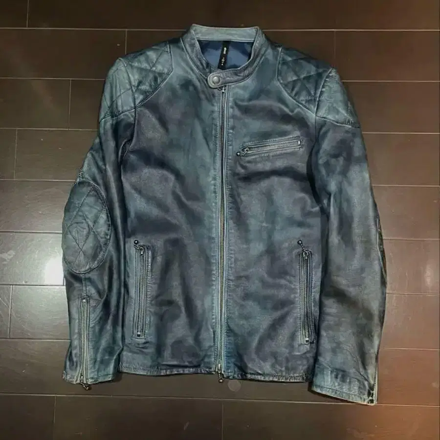 퀼팅 디테일이 특징인 블루 가죽 싱글 라이더 자켓.