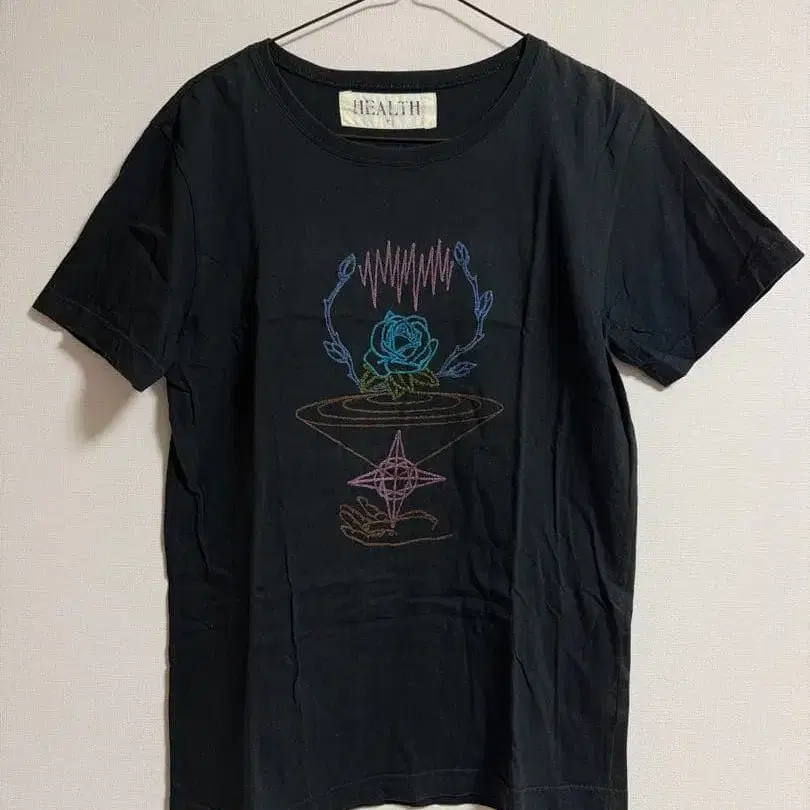컬러풀한 자수가 놓인 블랙 T셔츠.