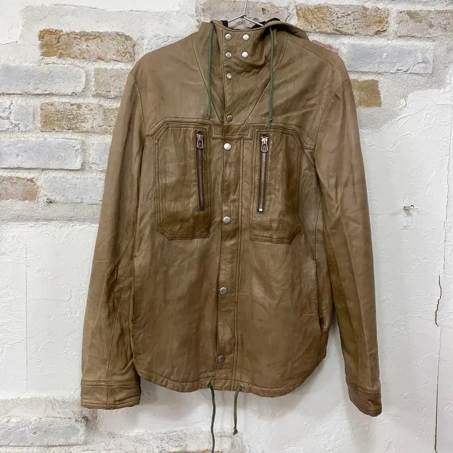 자동 번역되었어요. 원문보기후드 부착 브라운 가죽 자켓, 지퍼 포켓 부착으로 기능적입니다.