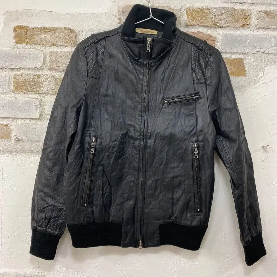 스탠드 카라 블랙 가죽 자켓, 지퍼 포켓 부착으로 캐주얼 스타일에 최적.