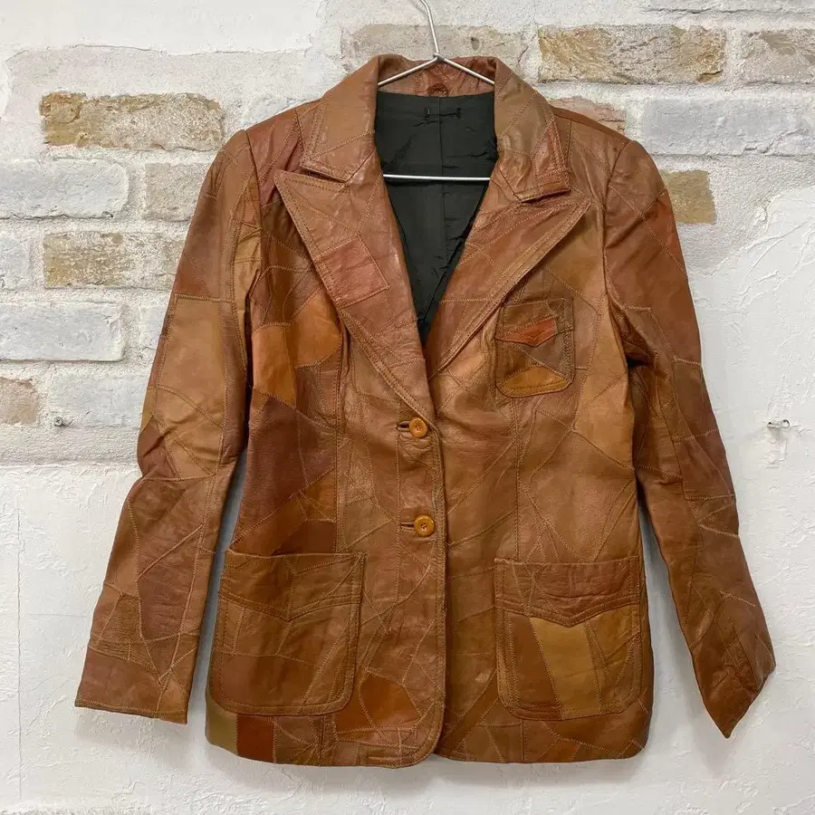 유니크한 브라운 패치워크 디자인의 가죽 블레이저.