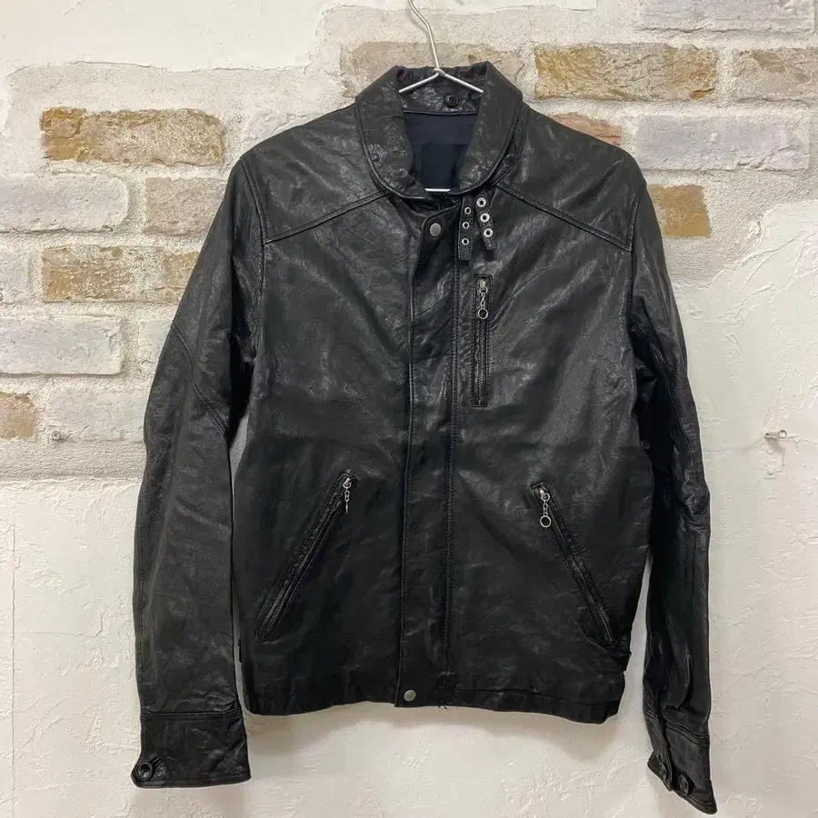 스탠드 카라와 지퍼 포켓이 특징인 블랙 가죽 싱글 라이더 자켓.