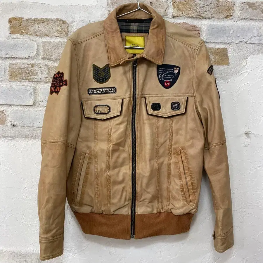 패치가 달린 베이지색 가죽 플라이트 재킷입니다. 지퍼로 여닫을 수 있으며, 포켓이 달려 있어 실용성도 겸비했습니다.