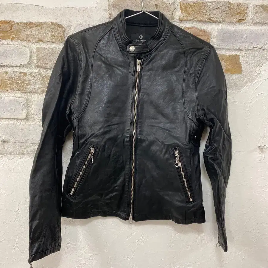 싱글 라이더 디자인의 블랙 가죽 자켓, 사이드 포켓에 지퍼가 있어 기능적입니다.
