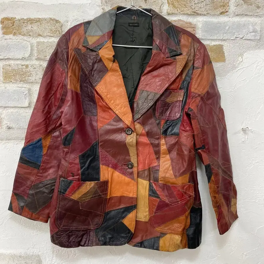패치워크 디자인의 가죽 자켓, 멀티 컬러로 개성 있는 스타일.