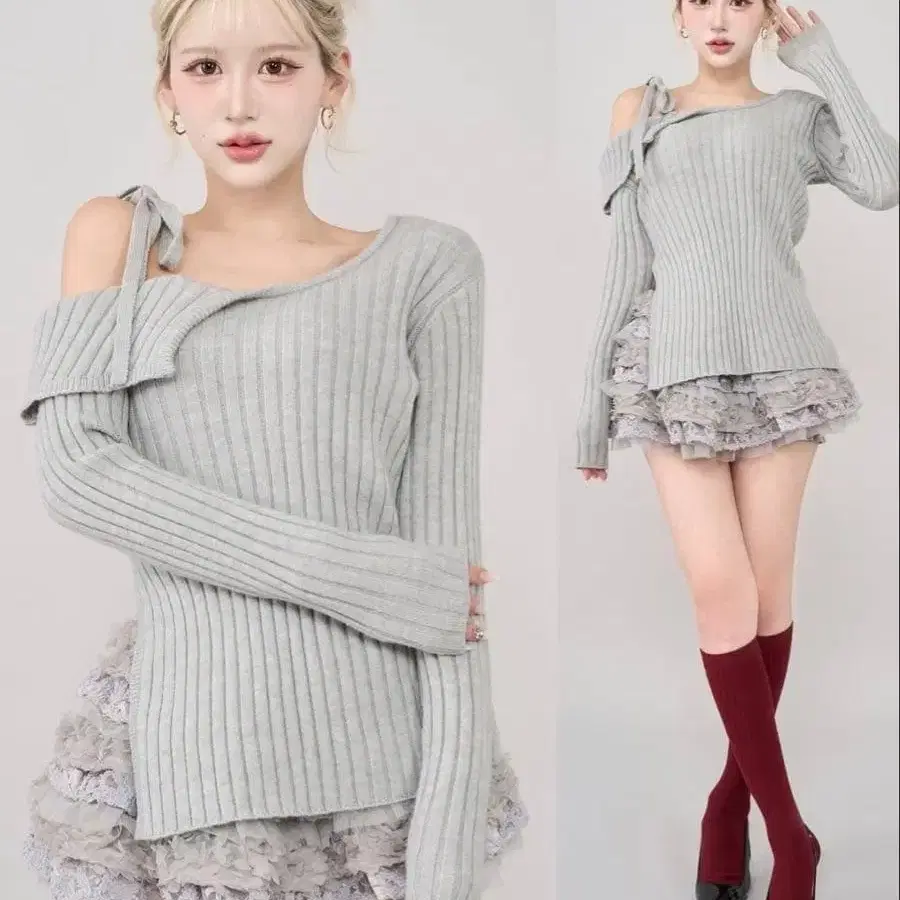 [새상품급] GRL 오프숄더 샤기 니트탑 튤 스커트 셋업