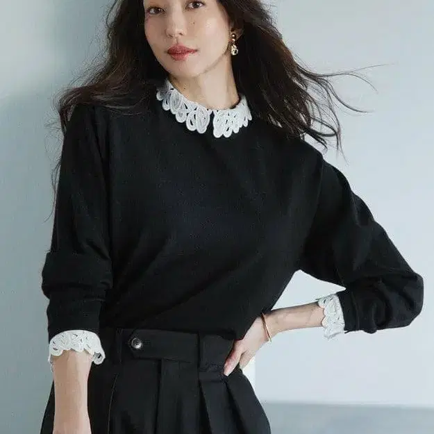 레이스 블라우스를 레이어드한 듯한 디자인으로, 소매의 레이스도 니트와 겹쳐 레이어드처럼 보이도록 고안했습니다. 뒷면 옷깃에 버튼이 있어 입고 벗기 편리한 사양입니다. 스커트와 함께 코디하면 큐트하게, 팬츠와 함께 코디하면 너무 달지 않은 절묘한 밸런스의 코디가 완성됩니다.