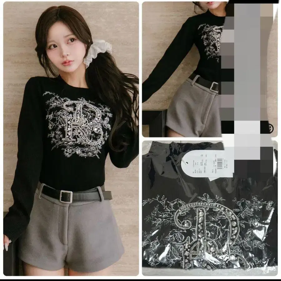 택 포함 새상품! 자수 비쥬 플라워 리브 니트탑