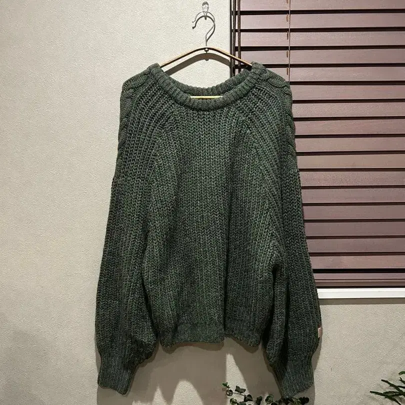 Java의 소매 볼륨감이 풍성한 니트입니다. 돌먼 실루엣이 멋스럽습니다. 등 부분은 케이블 니트로 되어 있습니다.