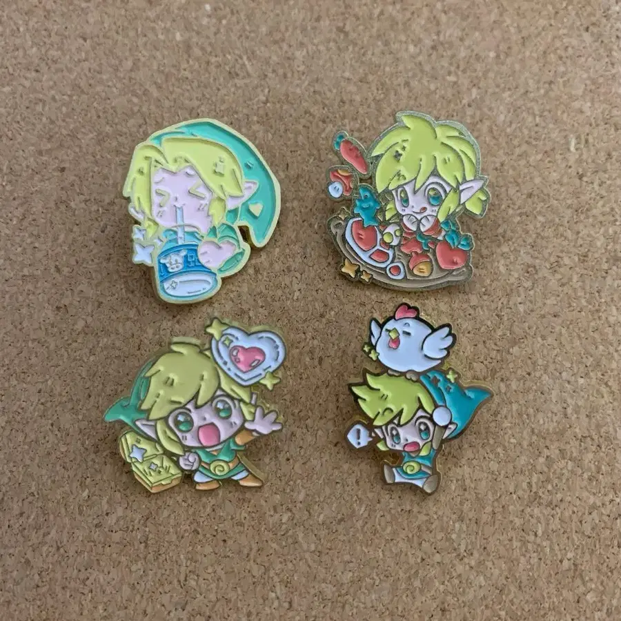 젤다의 전설 시간의 오카리나와 브레스 오브 더 와일드로 유명한 주인공 링크의 핀 배지 4개 세트입니다.