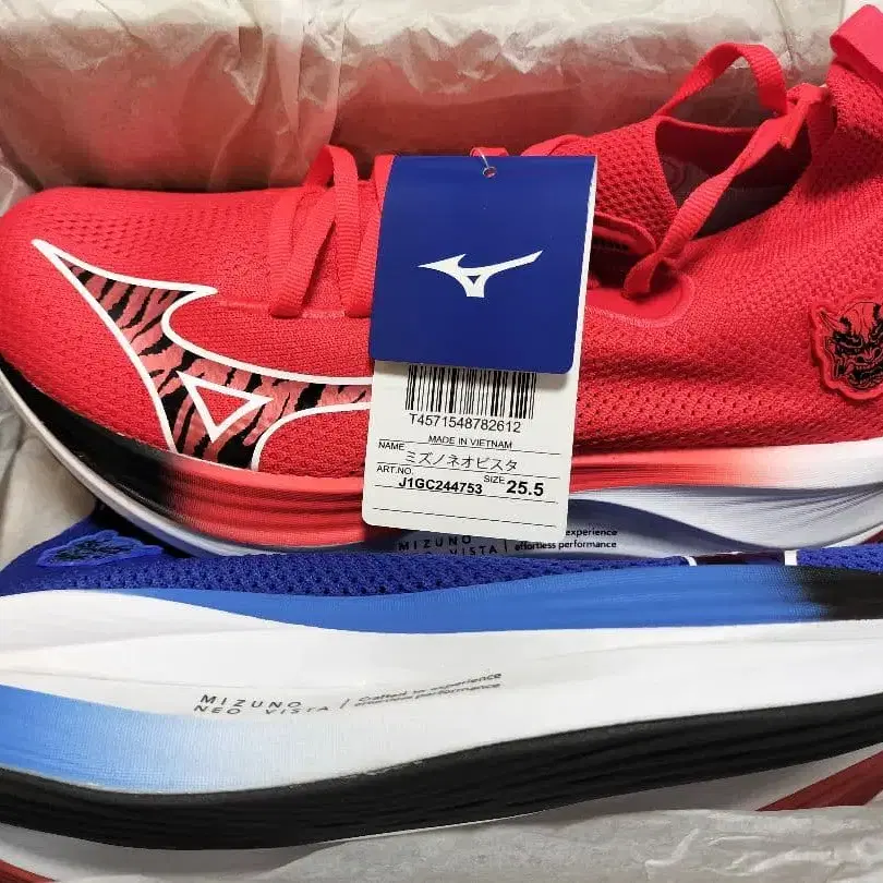 쿠션성과 반발성이 뛰어난 Mizuno의 neo vista, 사이즈 25.5cm, 레드/블루 디자인. - 브랜드: Mizuno - 모델명: neo vista - 사이즈: 25.5cm - 색상: 레드/블루 - 밑창 소재: 경량 소재 - 특징: 쿠션성과 반발성이 뛰어난 디자인 - 아웃솔 디자인: 물결 모양 패턴 방문해 주셔서 감사합니다.