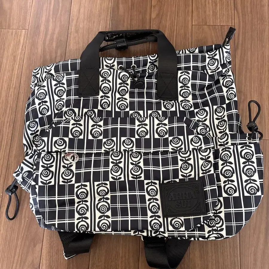 화이트 블랙 장미 패턴 디자인에 조정 가능한 핸들이 달린 ANNA SUI 백팩.