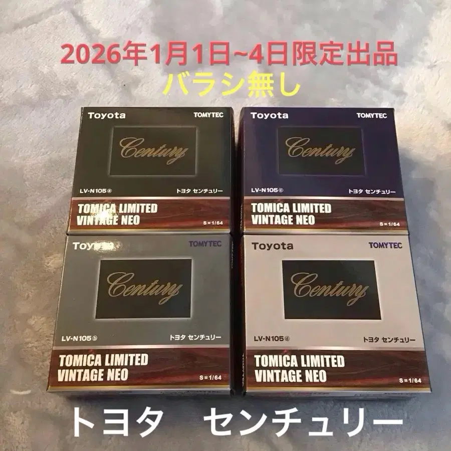 토미카 한정판 도요타 센추리 4개 세트, 1/64 스케일로 컬렉션에 최적. - 모델명: 도요타 센추리 - 브랜드: 토미카 - 전개: 한정판 - 스케일: 1/64 - 수량: 4개 세트 방문해 주셔서 감사합니다.