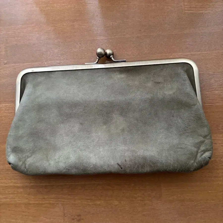 카키 가죽 소재 가마구치 장지갑. 내부에 지퍼 포켓과 카드 포켓이 있습니다.