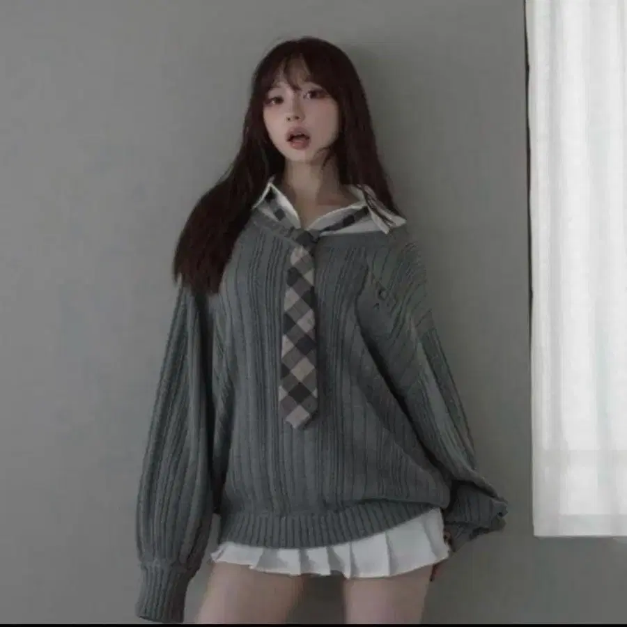 그레이 라운드넥 니트 [M] 라메 있음