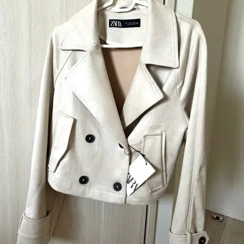 베이지 색상의 더블 브레스트 자켓, 블랙 버튼으로 스타일리시합니다. - 브랜드: ZARA - 색상: 베이지 - 스타일: 더블 브레스트 자켓 - 버튼 색상: 블랙 - 소매 디자인: 버튼 포함 방문해 주셔서 감사합니다. 사이즈 - S