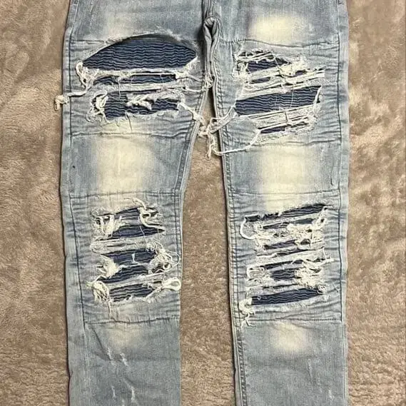 데미지 가공이 특징인 라이트 블루 데님 팬츠. - 색상: 라이트 블루 - 스타일: 데미지 가공 - 핏: 슬림핏 - 포켓: 백 포켓 있음 - 디자인: 리페어 디자인 방문해 주셔서 감사합니다.