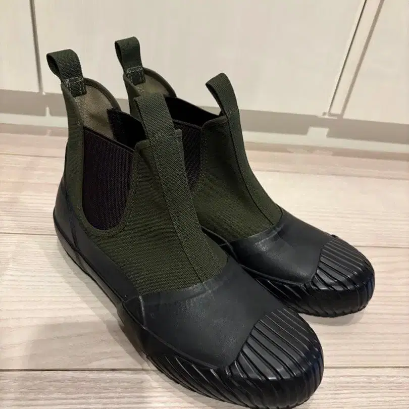 자동 번역되었어요. 원문보기올리브 그린 사이드 고어 부츠, 러버와 합성섬유의 콤비네이션으로 내구성과 스타일을 양립.