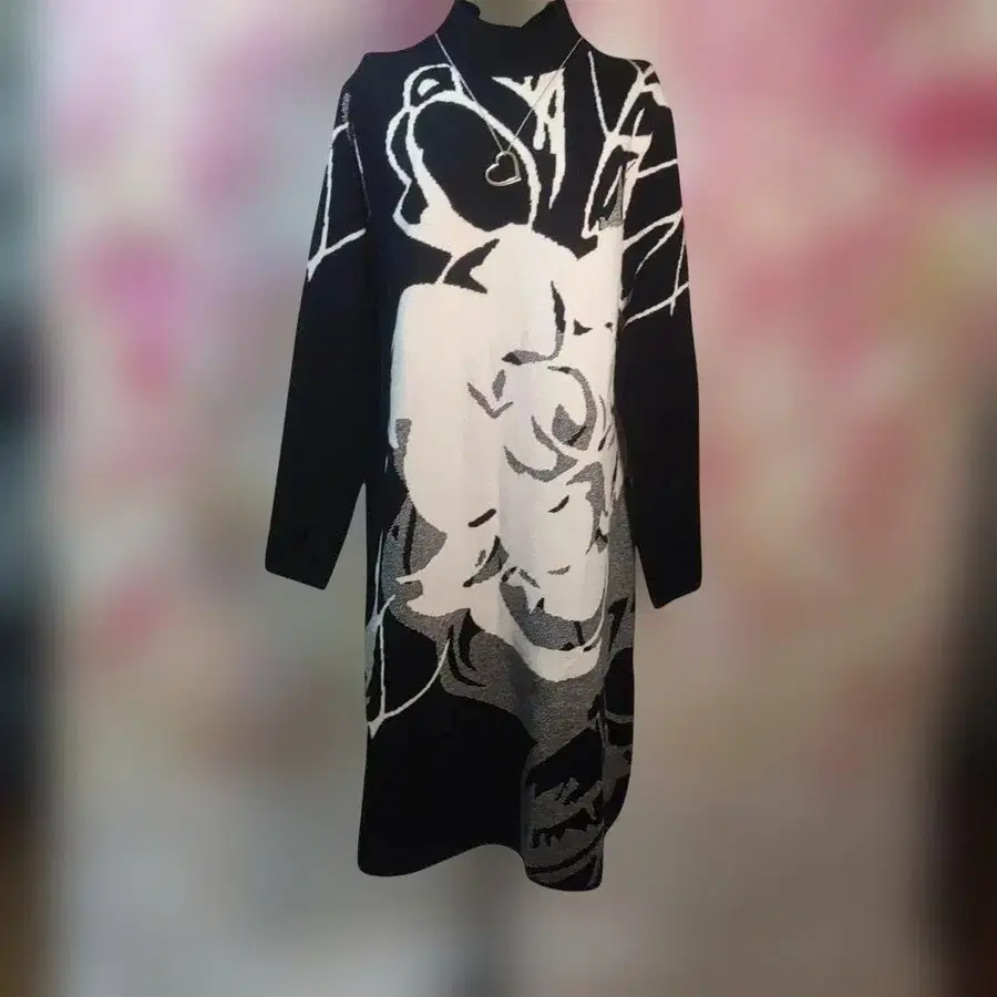 대담한 꽃무늬가 시선을 사로잡는, 존재감 있는 뜨개질 니트 원피스입니다.