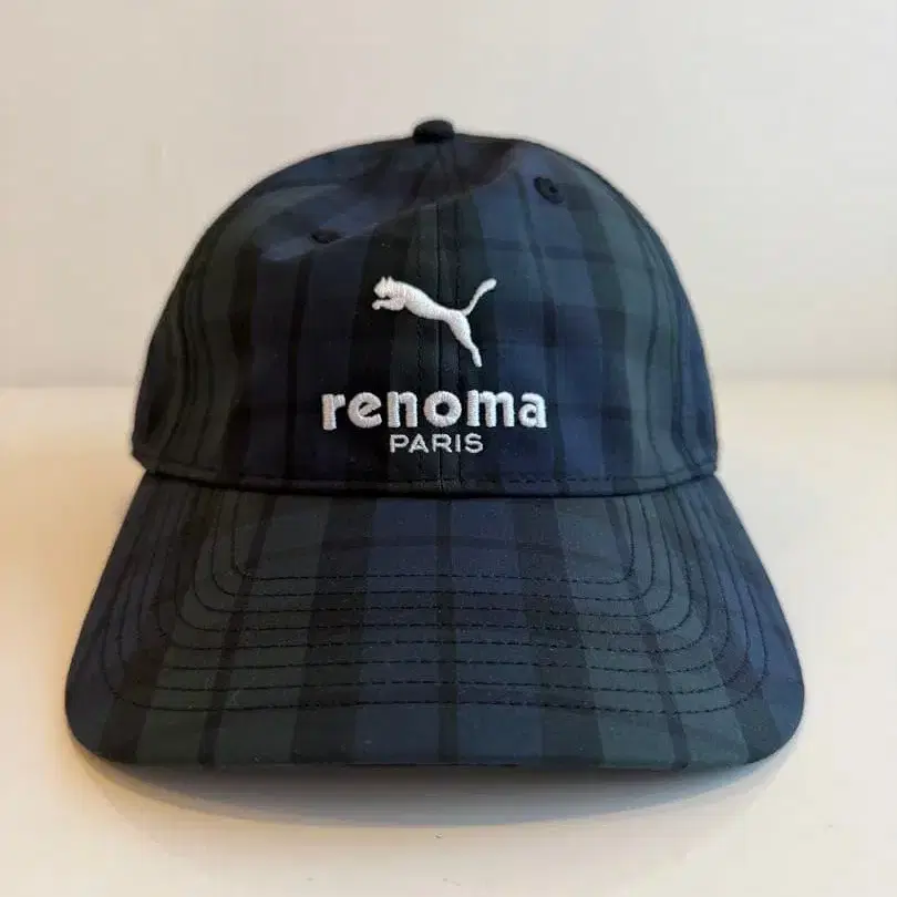 다크 블루 체크 무늬 캡, PUMA 로고 포함, 백 조절 기능으로 사이즈 조절 가능.