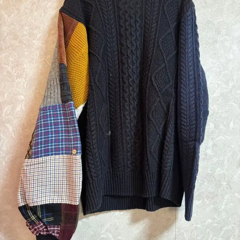 구제 의류점에서 구매한 다크 네이비 색상의 케이블 니트와 패치워크 디자인의 스웨터입니다. 소매 디자인이 특징적입니다.
