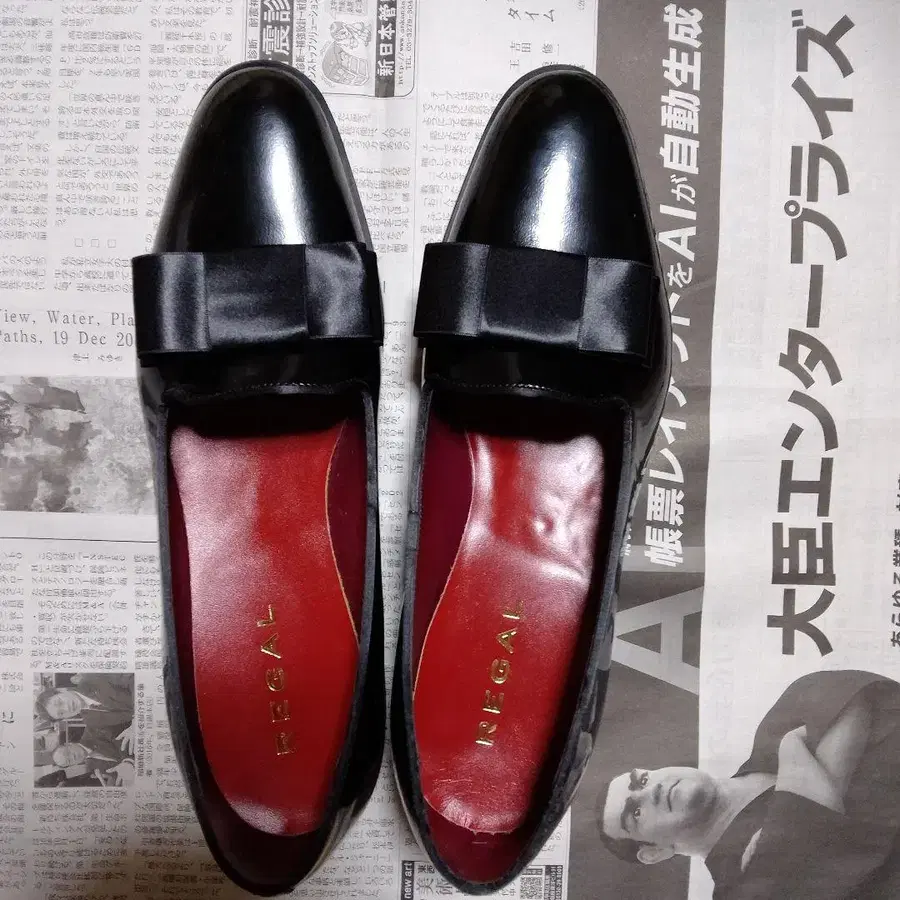 리본이 달린 블랙 가죽 로퍼, 빨간색 인솔이 특징입니다. - 브랜드: REGAL - 색상: 블랙 - 디자인: 리본 포함 - 소재: 가죽 - 인솔: 빨간색 - 스타일: 로퍼 방문해 주셔서 감사합니다. 색상 - 블랙 계열 얼룩, 찢김, 냄새 등 - 없음