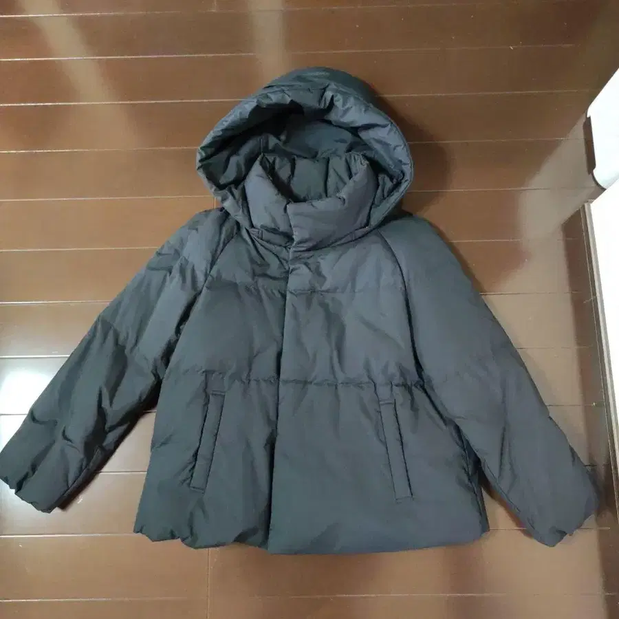 심플하고 스타일리시한 블랙 다운 자켓, 탈부착 가능한 후드 부착.