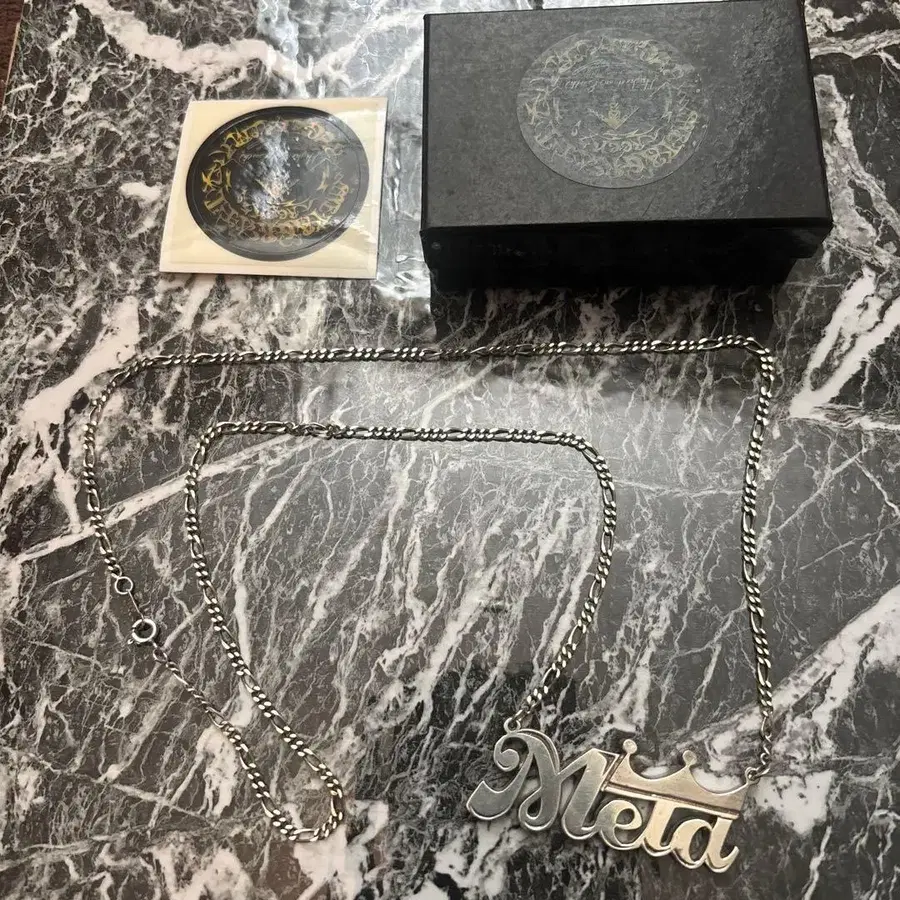 실버 소재의 Meta 목걸이, 박스와 스티커 포함.