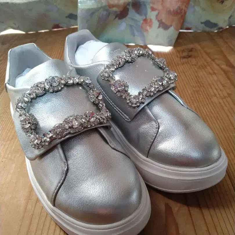 비쥬 장식이 있는 실버 셀퓨어드 스니커즈. - 색상: 실버 - 장식: 비쥬 부착 - 디자인: 슬립온 방문해 주셔서 감사합니다. 정가: 18,000엔 (세금 포함 19,800엔) 사이즈: 23cm 색상: 실버
