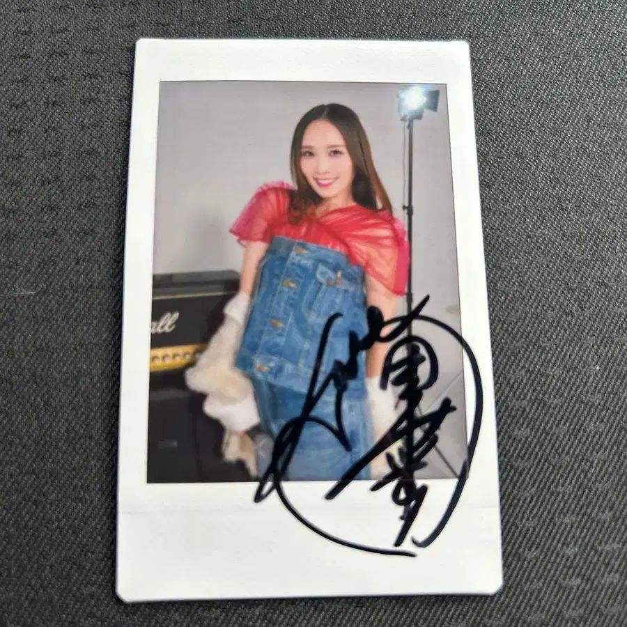 데님 오버롤을 입은 폴라로이드 사진, 사인 포함. - 사인: 있음 - 사진 스타일: 폴라로이드 - 의상: 데님 오버롤과 빨간색 상의 - 배경: 스튜디오 배경 - 촬영 기자재: 기타 앰프가 배경에 있음 방문해 주셔서 감사합니다.