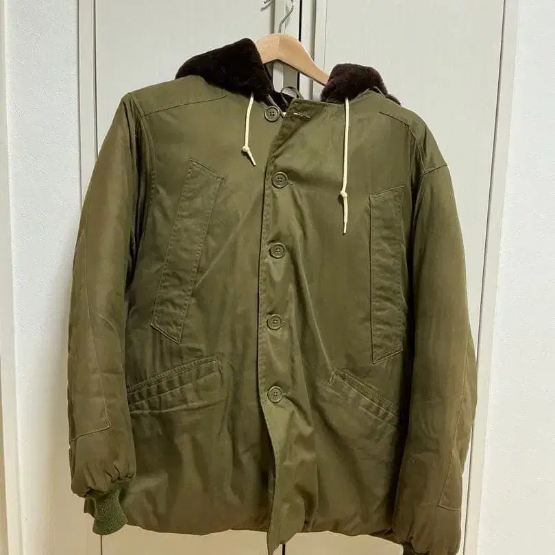 올리브 색상의 퍼가 달린 후드와 리브 소매가 특징인 밀리터리 자켓.