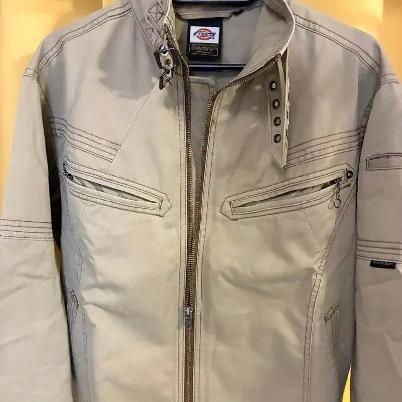 지퍼 포켓이 특징인 베이지 자켓과 팬츠 세트. - 색상: 베이지 - 디자인: 지퍼 포켓, 스탠드 카라 - 색상: 베이지 - 색상: 베이지 - 디자인: 지퍼 포켓 사이즈 - 자켓 M, 바지 M