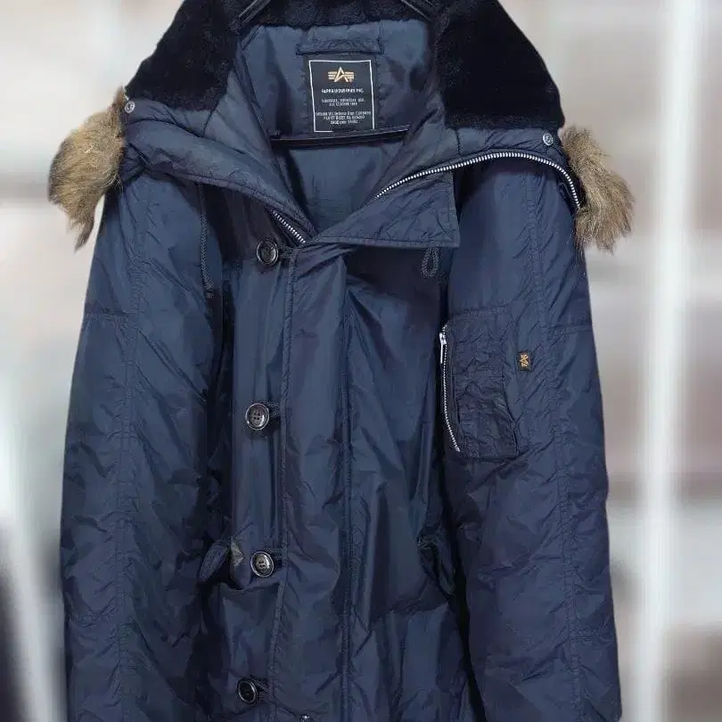 네이비 색상의 ALPHA INDUSTRIES 밀리터리 자켓입니다. 퍼가 달린 후드와 단추식 디자인이 특징입니다.