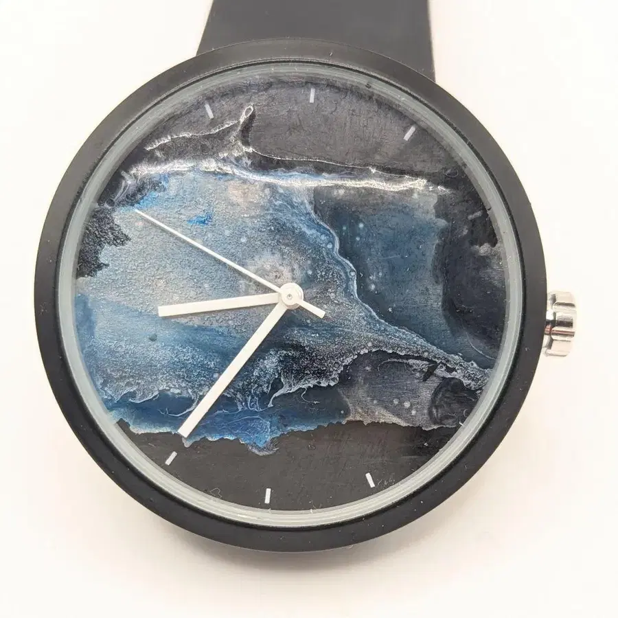 아트풍의 파랑과 블랙 그라데이션 다이얼 손목시계. 케이스 사이즈: 약 4.3cm 벨트: 실리콘 벨트 시계 작동에는 문제가 없습니다. 강한 충격을 주면 다이얼의 레진이 깨질 수 있으니 주의해 주세요.