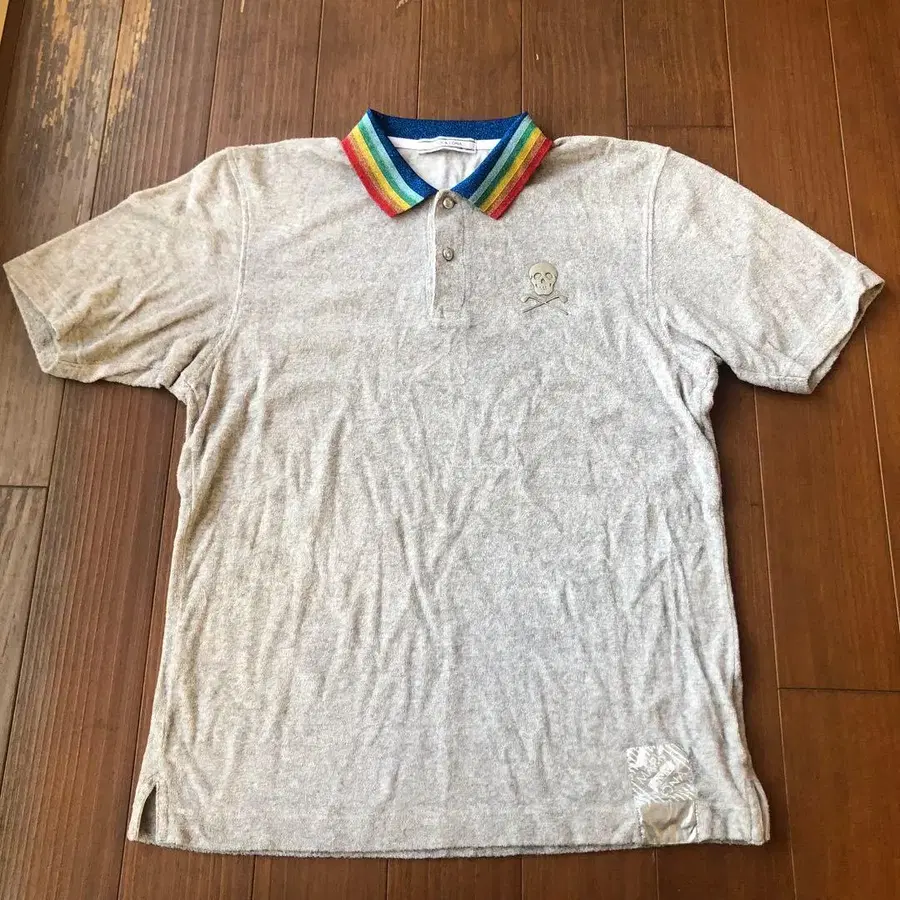 해골 모티브 자수와 컬러풀한 스트라이프 옷깃이 특징인 피케 셔츠입니다. - 브랜드: MARK & LONA - 색상: 그레이/레인보우 컬러 - 디자인: 해골 모티브 자수 - 옷깃: 스트라이프 컬러 - 스타일: 피케 셔츠 색상은 옅은 그레이이며 소재는 타월 원단과 같은 느낌입니다. 사진에는 주름이 많아 보이지만 접어서 보관했기 때문입니다. 5~6회 착용했지만 상태는 나쁘지 않습니다. 원단의 늘어남도 신경 쓰이지 않습니다. 집에서 세탁한 후 접어서 서랍에 보관했습니다. 냄새 등이 신경 쓰이시는 분은 한 번 클리닝에 맡긴 후 사용해 주세요. 가슴에 있는 해골 마크는 금속인데 표면이 마찰되어 색이 변한 부분이 있습니다. 세탁으로 인한 것인지 플레이 중 생긴 것인지는 모르겠습니다. 사진으로 확인해 주세요. 사이즈 - L 저는 170cm, 65kg으로 보통 체격입니다. 보통 위화감 없이 착용할 수 있었습니다. 검토를 부탁드립니다.