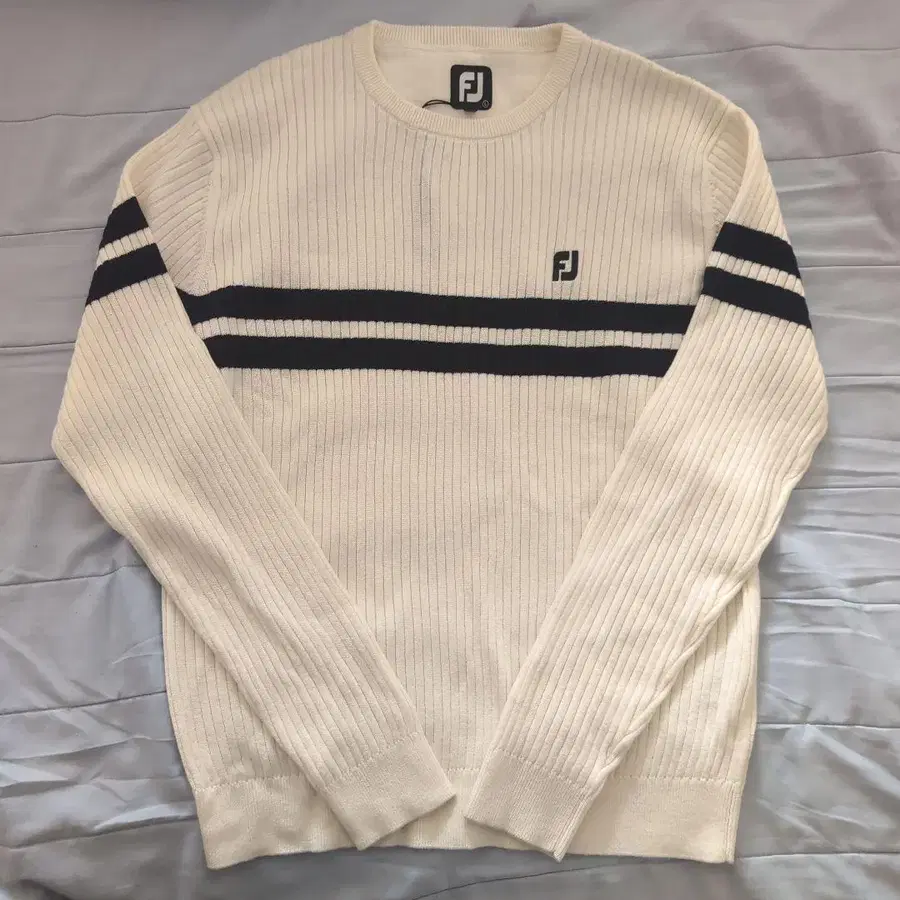 화이트 스트라이프 디자인의 FJ 스웨터, L 사이즈. 색상은 화이트보다는 크림색에 가깝습니다.