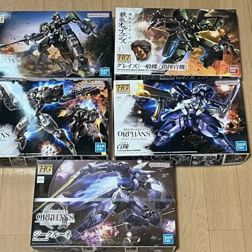 다양한 HG 건담 프라모델 세트, 철혈의 오펀스와 Z 건담 포함.