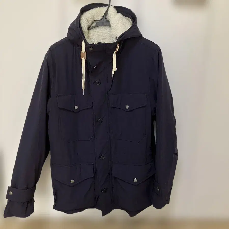 보아 안감과 탈부착 가능한 후드가 달린 네이비 색상의 마운틴 후드티.