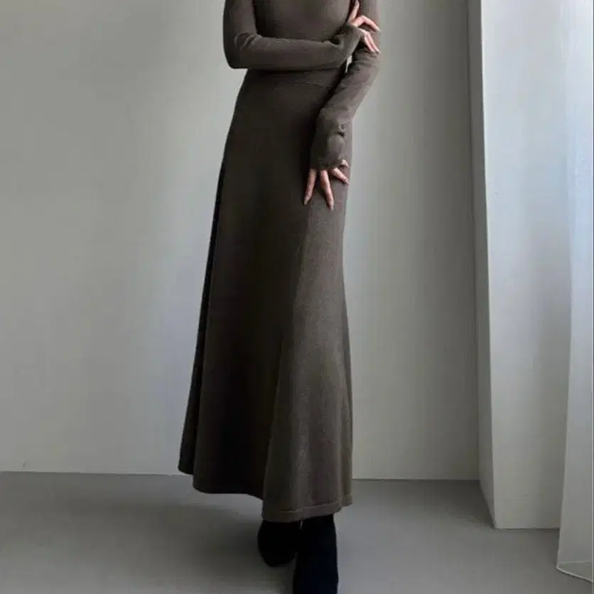 비대칭 디자인이 특징인 오프숄더 스타일의 니트 원피스.
