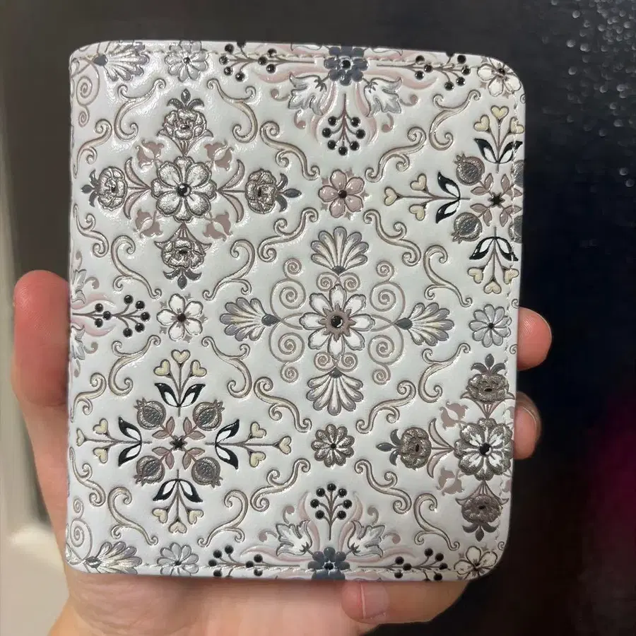 블랙 베이스에 떠오르는 섬세한 문양은 고대 오리엔트의 장식과 실크 로드의 이국적인 정취를 느끼게 하는 일품입니다. 컴팩트하고 사용하기 쉬우며, L자 지퍼 사양으로 개폐도 부드럽습니다.
