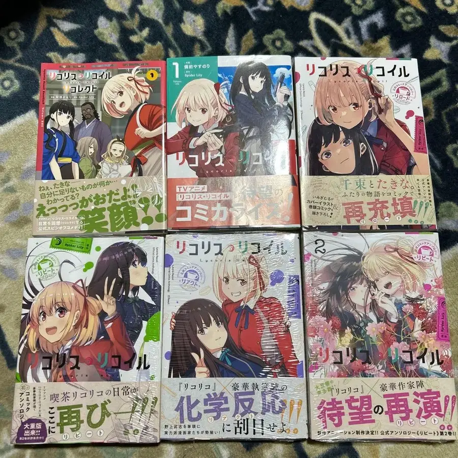 리코리스 리코일 코믹스 묶음 판매입니다. 사진 상단 3권은 개봉품입니다. 리액트, 리피트 3권은 슈링크 포함입니다.