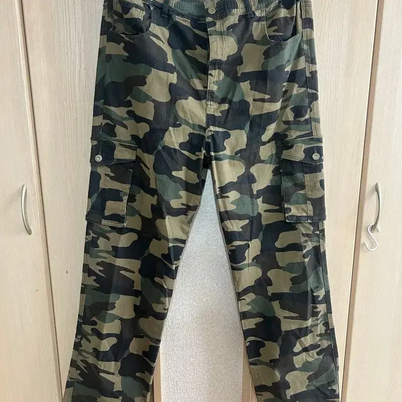 카모 패턴 카고 팬츠, 실용적인 포켓 부착. - 색상: 카모플라쥬 - 스타일: 카고 팬츠 - 데미지: 작은 올풀림 있음 방문해 주셔서 감사합니다. 소재: 면 100% [ 치노 ] 면 98% 폴리우레탄 2% 3L 사이즈: 허리 98-110cm 밑위 35cm 인심 83cm 허벅지 35cm 밑단 폭 25(7부 기장 22)cm 허리밴딩으로 편안한 착용감이 매력적인 카모 패턴 카고 팬츠입니다. 전체적으로 약간 넉넉한 디자인에 더해, 허리는 밴딩&끈 사양으로 허리둘레에 신축성을 더한 이지 타입이라 허리가 조이는 듯한 답답함을 경감시켜 스트레스 없이 편안하게 착용할 수 있습니다. 또한 벨트 루프도 있어 평소처럼 벨트를 착용할 수도 있으며, 사이드 포켓도 약간 깊게 만들어져 수납력도 좋습니다. 원단감은 너무 두껍지도 얇지도 않아 사계절 활약하며, 튼튼한 데님 소재를 사용하여 촉감도 좋아 오랫동안 활용할 수 있습니다. 자택 보관이므로 이해해 주시는 분만 구매 부탁드립니다.