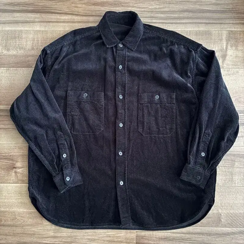 블랙 코듀로이 긴팔 셔츠, 버튼 다운 칼라와 앞면에 2개의 포켓 부착.